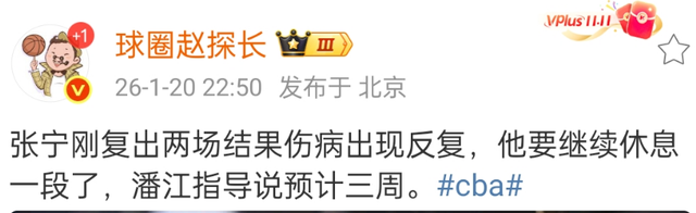 险胜辽宁男篮的比赛后,潘江介绍了张宁的伤病情况,由于拉伤出场了反复,张宁需要休息三周的时间,由于随后会进入窗口期,张宁有一个比较长的时间进行康复。
