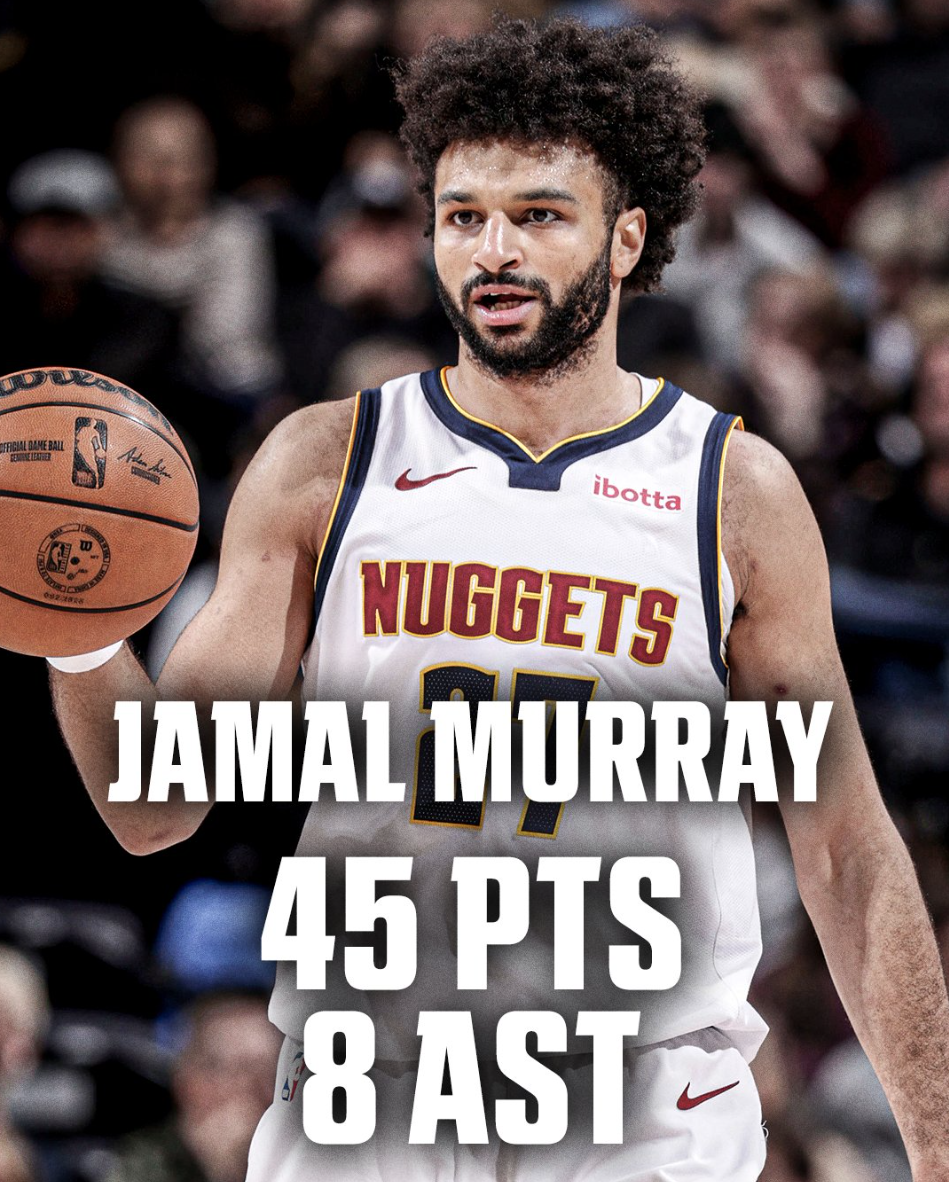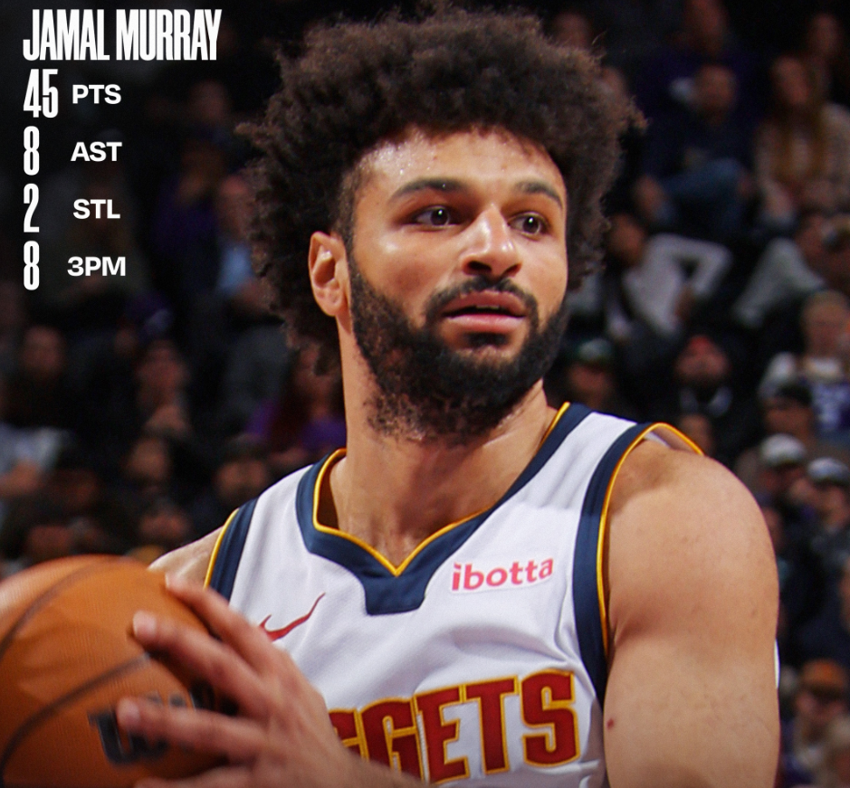 此役贾马尔-穆雷37分钟,19中13,三分13中8,罚球12中11,拿到45分8助攻2篮板2抢断7失误,命中率68.4%,三分命中率61.5%,真实命中率69.4%,正负值+2。
