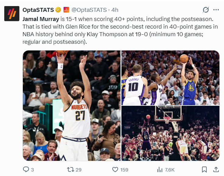 4.本赛季穆雷拿到4次40+,掘金则拿到4胜0负;