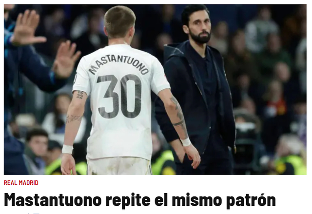 18岁的马斯坦托诺,再次回归替补席。3月5日,《马卡报》和《阿斯报》撰文,分析阿根廷小马哥的处境。阿隆索、阿韦洛亚两任皇马主帅,都非常信任马斯坦托诺,但阿根廷小将未能证明自己。